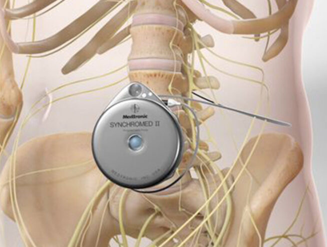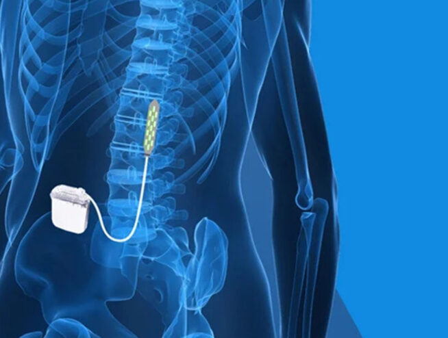 Implantation of electrodes near the spinal cord to deliver electrical impulses for pain relief.